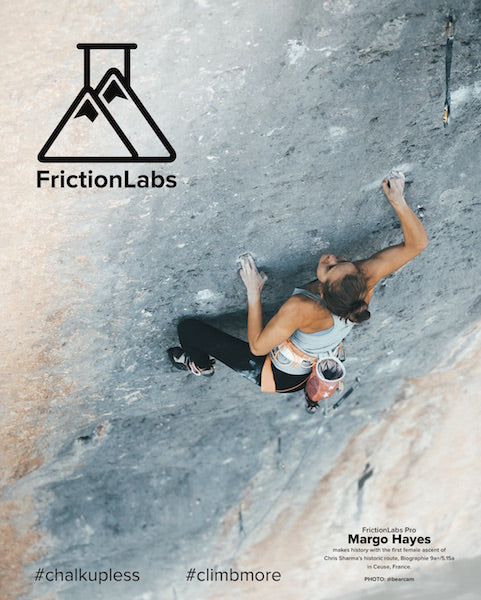 Limited edition poster of FrictionLabs Pro Margo Hayes making history with the first female ascent of Chris Sharma's historic route, Biographie 9a+/5.15a in Ceuse, France.